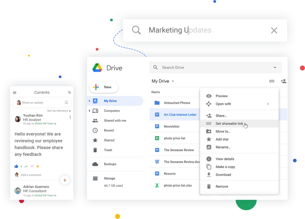Search across all your organizations content. From Gmail and Drive to Docs, Sheets, Slides, Calendar, and more.
